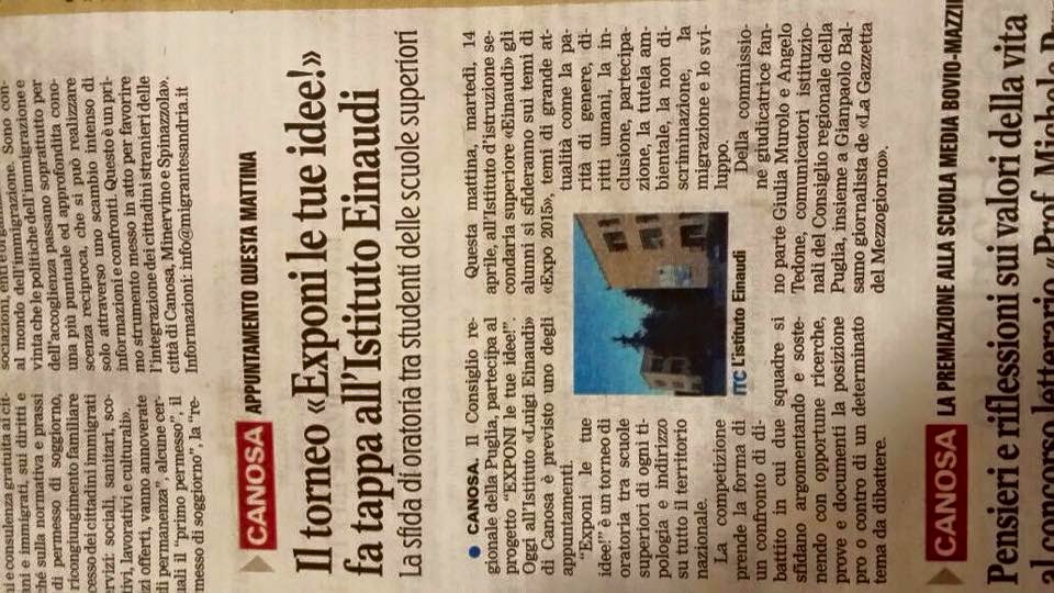 Domani, 14 aprile, gli alunni si sfideranno sui temi di EXPO 2015 di grande attualità come : parità di genere, diritti umani, inclusione, partecipazione, tutela ambientale, non discriminazione, migrazione e sviluppo. Nella commissione giudicatrice Giulia Murolo e Angelo Tedone comunicatori istituzionali del Consiglio Regionale della Puglia, insieme a Gianpaolo Balsamo giornalista de La Gazzetta del Mezzogiorno. Leggi la Notizia